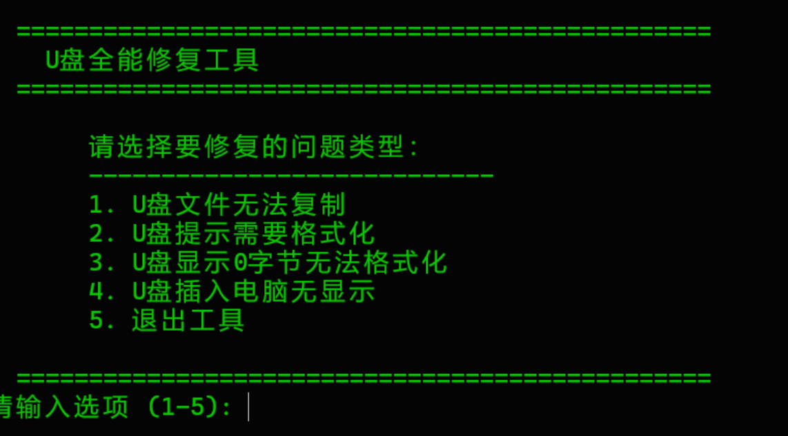 打开以后其有4个选择。有“U盘文件无法复制”、“U盘提示需要格式化”、“U盘显示0字节无法格式化”、“U盘插入电脑无显示”。大家根据选择进行选择即可。不过在选择盘符时,不要忘了在盘符后加多个冒号。这款软件不要对它有太多的期待,就当死马当活马医的一个选择。其他的大家自己去体验!